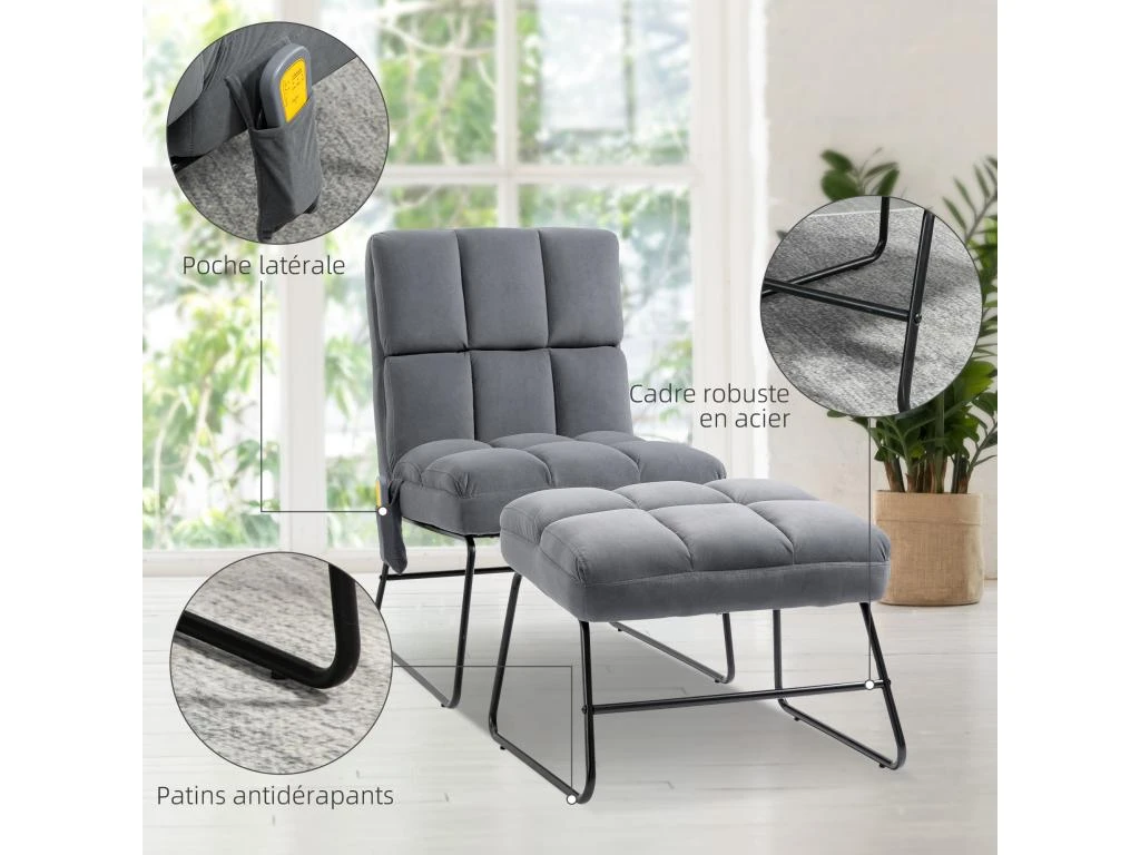 – Matériaux principaux : revêtement aspect velours (100% polyester), acier, garnissage mousse