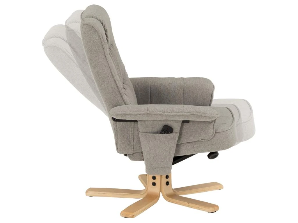 – Le revêtement du fauteuil et du repose-pieds est en tissu de coloris gris clair.