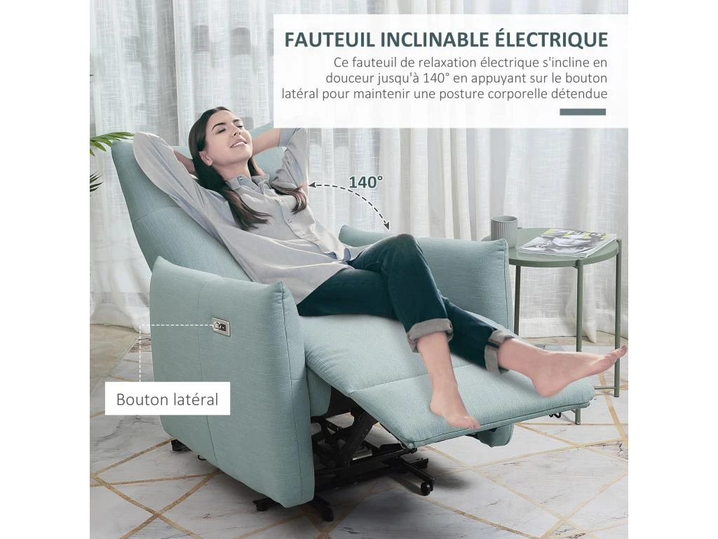 – Équipé d’un dossier inclinable (jusqu’à 140°) et d’un repose-pieds relevable électriquement en appuyant sur le bouton de commande latéral