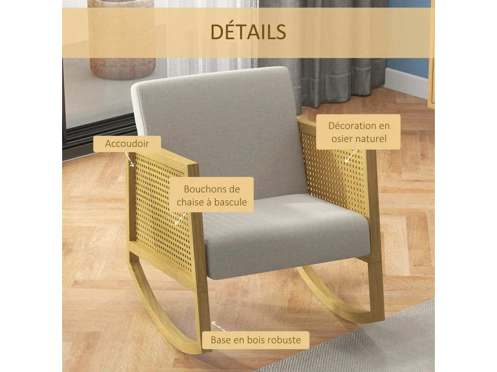 – Matériaux principaux : bois d’hévéa, rotin, garnissage mousse, tissu 100% polyester toucher lin