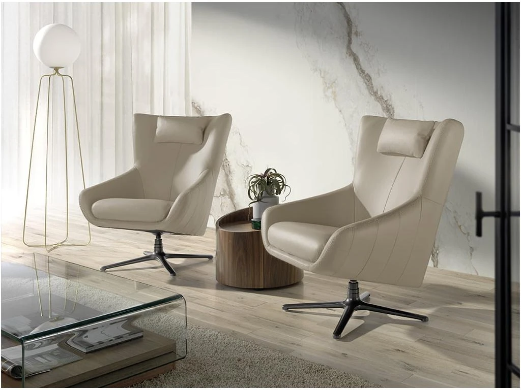 Fauteuil pivotant tapissé en cuir taupe de 1,5mm d’épaisseur. Le confort supplémentaire est assuré par son assise et son dossier rembourrés de mousse polyuréthane de 25kg/m3, ainsi que par son coussin d’appui-tête inclus. Sa base en acier inoxydable foncé apportera la touche d’avant-garde et d’élégance que vous recherchez pour votre intérieur. Ce fauteuil design moderne d’Angel Cerdá combine le style et la personnalité uniques de la marque, ainsi que le plus grand confort et la plus grande stabilité, grâce au rembourrage souple et à la structure originale des pieds.
